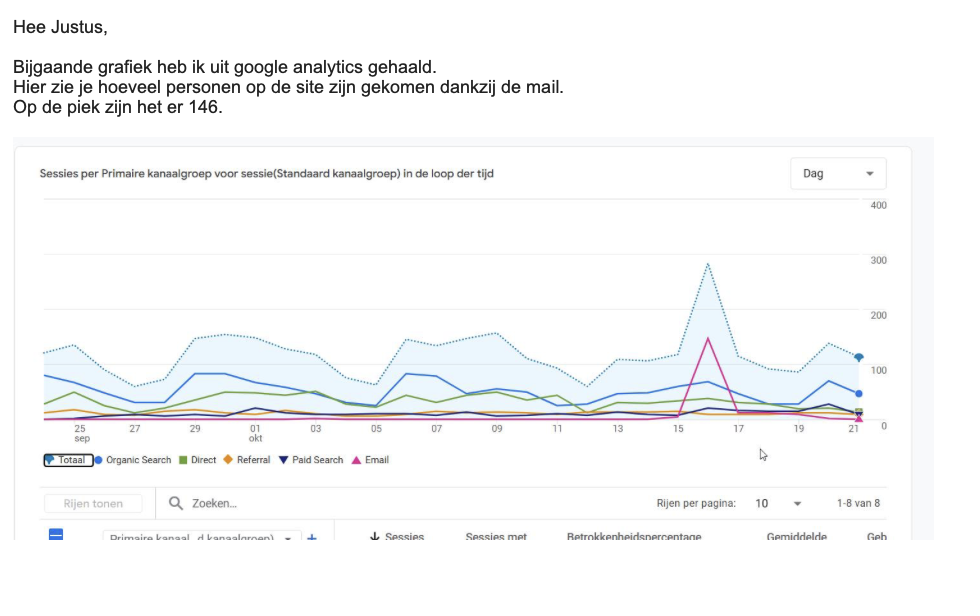 Daarnaast heeft de student Nathalie de opdracht gegeven om de website te actualiseren en content te vertalen, waaronder nieuwsberichten, agenda-items en pop-ups (zie Bijlage 4). Het effect hiervan is gemonitord via Google Analytics, waaruit een duidelijke stijging in bezoekersaantallen bleek. De campagne is verder ondersteund door een mailing naar circa 2.500 contacten (zie Bijlage 22) en door communicatie via LinkedIn. Tot slot werd Nathalie geïnstrueerd om een bel-lijst op te stellen voor geïnteresseerde stakeholders, te zien in de onderstaande figuren. Dit is gedaan door het mondeling te bespreken en vervolgens via de mail de actiepunten samen te vatten. Dit past bij de informele familiecultuur die past bij ZIN.