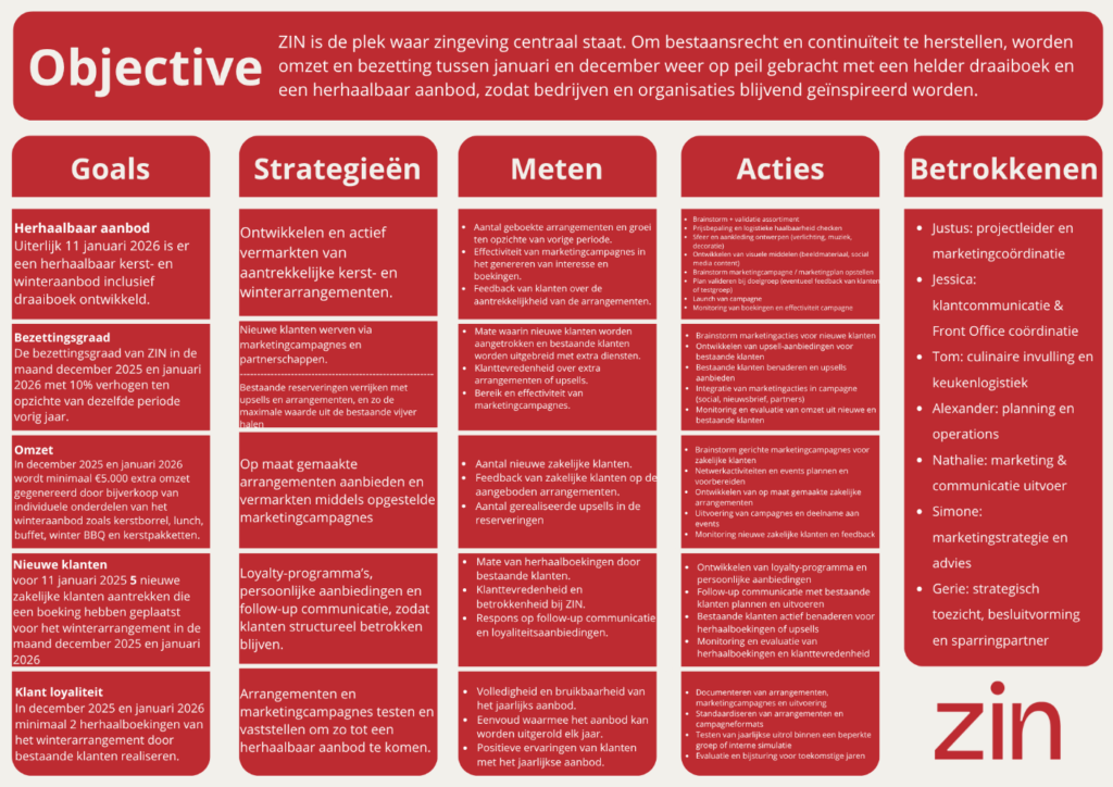 De Objective van het project is het verhogen van de bezetting van ZIN tijdens de wintermaanden. Het project sluit aan bij het bredere doel van ZIN: een plek zijn waar zingeving centraal staat. Om het bestaansrecht en de continuïteit van de organisatie te herstellen, wordt gestreefd naar het op peil brengen van omzet en bezetting tussen januari en december, ondersteund door een helder draaiboek en een herhaalbaar aanbod. Hiermee kunnen bedrijven en organisaties structureel geïnspireerd worden.