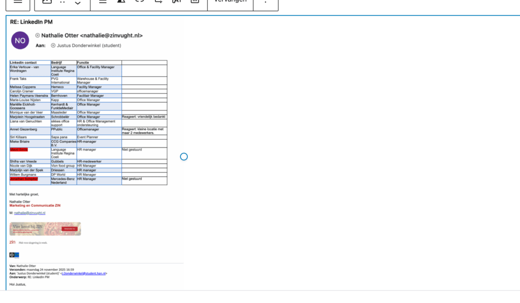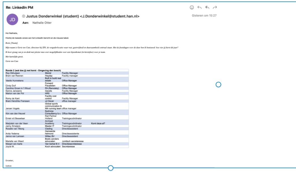 - LinkedIn persoonlijke berichten via Gerie’s account: 37 personen met relevante functies, zoals facility managers, office managers of HR-managers, zijn direct benaderd om interesse in het aanbod te wekken.