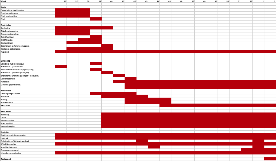 Het definitieve assortiment is vastgelegd in het interne assortimentsdocument (Bijlage 3) en volledig uitgewerkt in de externe brochure (Bijlage 5). Hiermee is geborgd dat het aanbod niet alleen inhoudelijk was vastgesteld, maar ook praktisch uitvoerbaar was en direct ingezet kon worden voor zowel communicatie als verkoop. Deze fase van het project is volledig conform planning afgerond.