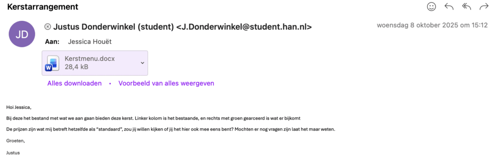 Op basis van alle opgehaalde input zijn extra kerstopties aan het assortiment toegevoegd (Bijlage 1). Daarnaast is besloten om vanaf december iedere lunch als kerstlunch aan te bieden, zodat de kerstsfeer structureel werd doorgevoerd in het dagelijkse aanbod. Ook zijn duidelijke randvoorwaarden vastgesteld, waaronder dat het pand uiterlijk 1 december volledig in kerstsfeer moest zijn aangekleed en dat vanaf dat moment alle tafels feestelijk gedekt zouden zijn.