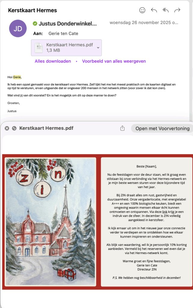 In overleg met Nathalie, Alex, Jessica en Gerie is bepaald welke marketingacties als basis zouden worden ingezet. Hierbij is aangesloten bij de gebruikelijke marketingaanpak van ZIN, die volgens Nathalie Otter sterk gericht is op persoonlijke communicatie. De gekozen basisacties bestonden uit het opzetten van een aparte landingspagina op de website om bezoekers langer vast te houden en gerichter te informeren over het aanbod. Daarnaast is een pop-up banner op de website geplaatst om de zichtbaarheid van het winter- en kerstaanbod te vergroten. De website is verder geactualiseerd met een nieuwsbericht en er is een mailing verstuurd naar het bestaande klantenbestand. Tot slot is een LinkedIn-post geplaatst die specifiek was gericht op de B2B-doelgroep.