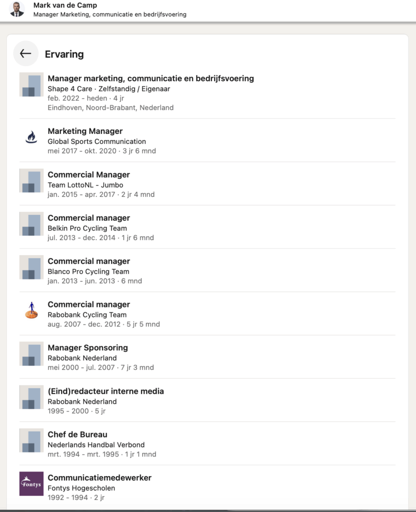 Ik heb mijn bestaande netwerk actief aangesproken en via LinkedIn gezocht naar professionals met ervaring in marketing en communicatie. Hierdoor kwam ik in contact met Mark van de Camp, een marketing- en communicatiemanager bij een particulier ergotherapiebedrijf. Zijn achtergrond en expertise bleken bijzonder waardevol voor ons project. Eerder werkte hij drie jaar als marketeer bij Global Sports, waar hij samenwerkte met gerenommeerde wielerploegen zoals Lotto Jumbo, Belkin en Rabobank (zie Figuur 1).