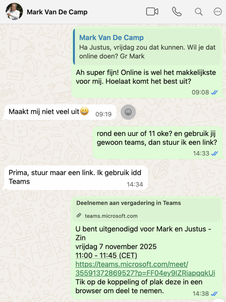 Het contact met Mark werd oorspronkelijk doorgestuurd door mijn moeder, die mij via WhatsApp met hem in contact bracht (zie Figuur 12). Omdat hij via haar indirect aan mijn netwerk verbonden was, heb ik deze contacten eerst benaderd om zijn rol en ervaring te verifiëren. Vervolgens heb ik op passende wijze rechtstreeks contact met hem opgenomen om de context van het project toe te lichten en een afspraak te plannen. Dit resulteerde in een Teams-meetingwaarin ik onze ideeën kon voorleggen en valideren (zie Figuur 2).