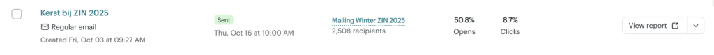 Voor dit doel is een nieuwsbrief opgesteld (bijlage 15), met als belangrijkste insteek het informeren en activeren van de doelgroep. De inhoud van de nieuwsbrief was gericht op het onder de aandacht brengen van het aanbod, waarbij de communicatie aansloot op de interesses en verwachtingen van de ontvangers. De resultaten hiervan waren opvallend positief: de nieuwsbrief behaalde een open rate van 50% (figuur 13). Dit percentage ligt aanzienlijk hoger dan het gemiddelde open rate van 21–22% dat Mailchimp rapporteert (Mailchimp, z.d.).